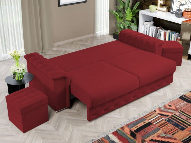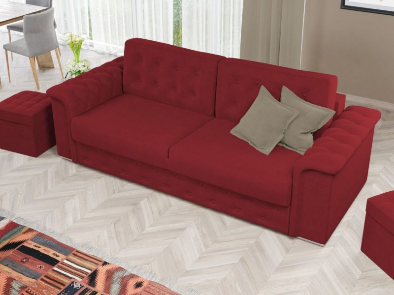 Canapeaua Olimp combina stilul si confortul, fiind alegerea potrivita pentru locuinta dumneavoastra. Nota eleganta este data de butonii decorativi prezenti pe brate, pe fata sezutului, pe cele doua perne detasabile, cat si de picioarele cu finisaj argintiu. Pe langa aspectul aparte, aceasta este prevazuta cu lada ideala pentru depozitarea lenjeriei, a pernelor sau a paturii si pentru a pastra la indemana toate articolele frecvent utilizate.