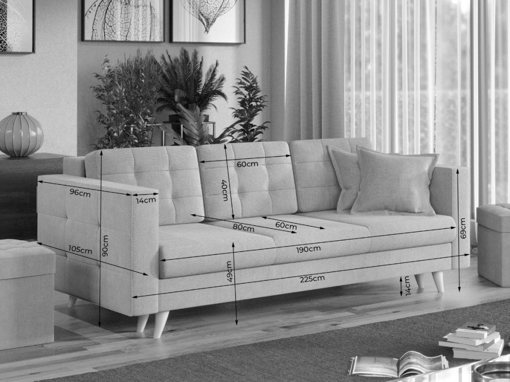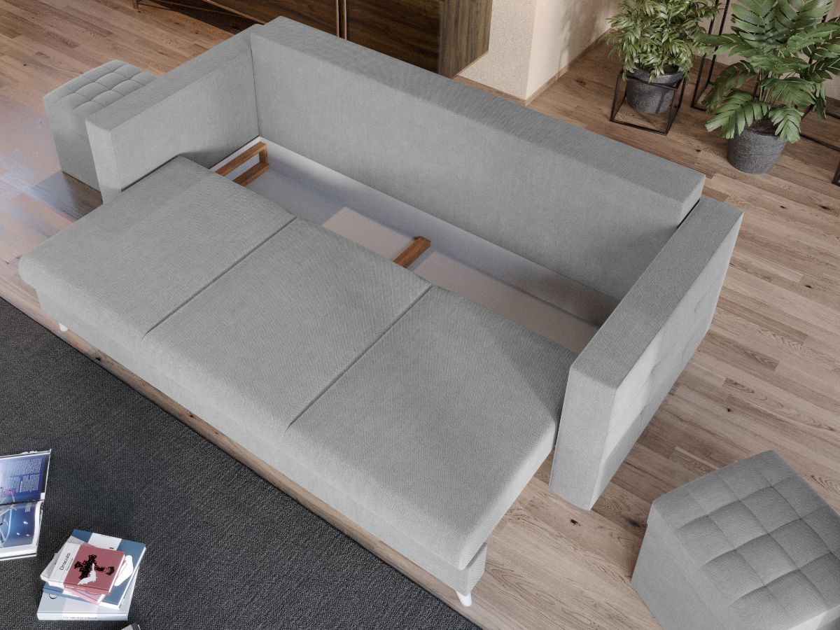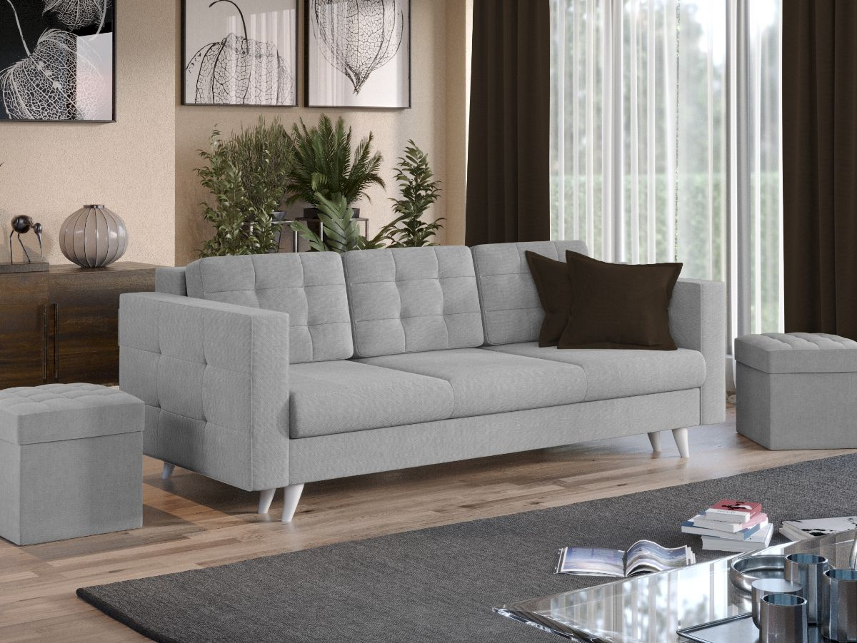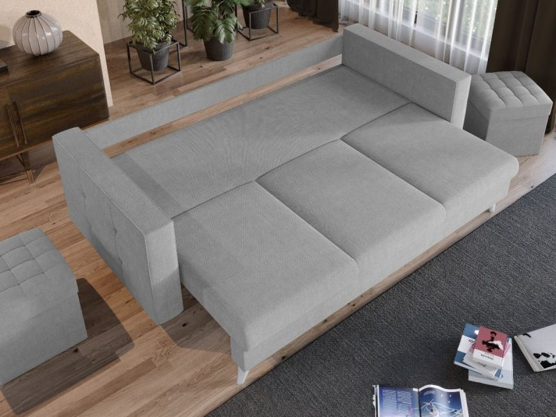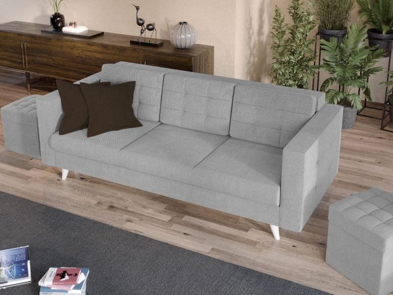 Canapeaua Santorini are un design modern, contemporan, cu un stil aparte. Picioarele sunt cu o forma usor arcuita si de culoare ivory. Se poate transforma intr-un pat confortabil in doar cateva minute si este prevazuta cu lada de depozitare. Ofera confort prin cele 3 perne detasabile, iar butonii de pe acestea si de pe brate dau un plus de eleganta si stil oricarui living.