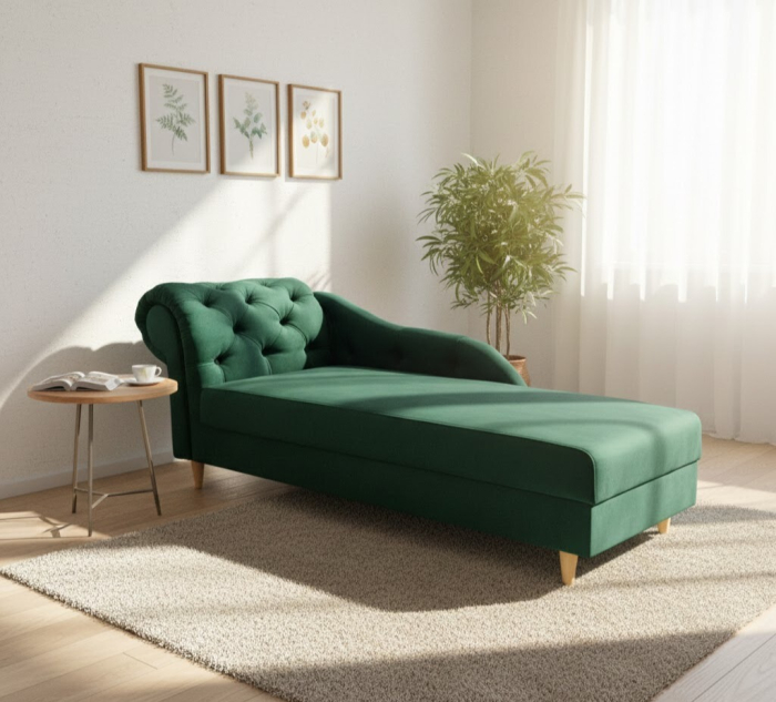 Canapeaua tip sezlong Zen este conceputa pentru a oferi un spatiu confortabil de relaxare, potrivit atat pentru locuinte, cat si pentru spatii comerciale. Designul sau echilibreaza eleganta clasica a stilului Chesterfield cu un aspect modern, minimalist. Nasturii discreti si liniile curate ii confera un aer sofisticat, fara a fi prea ornamentata.