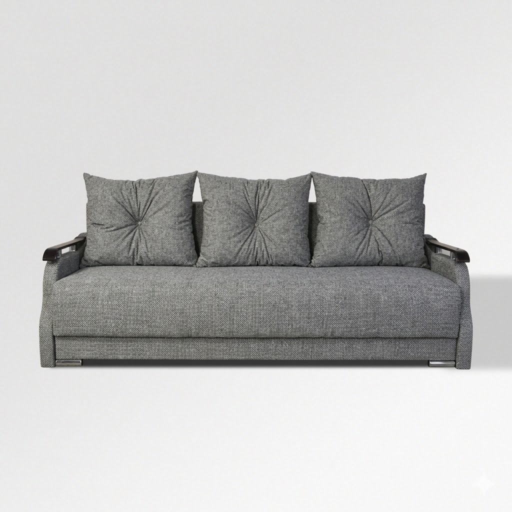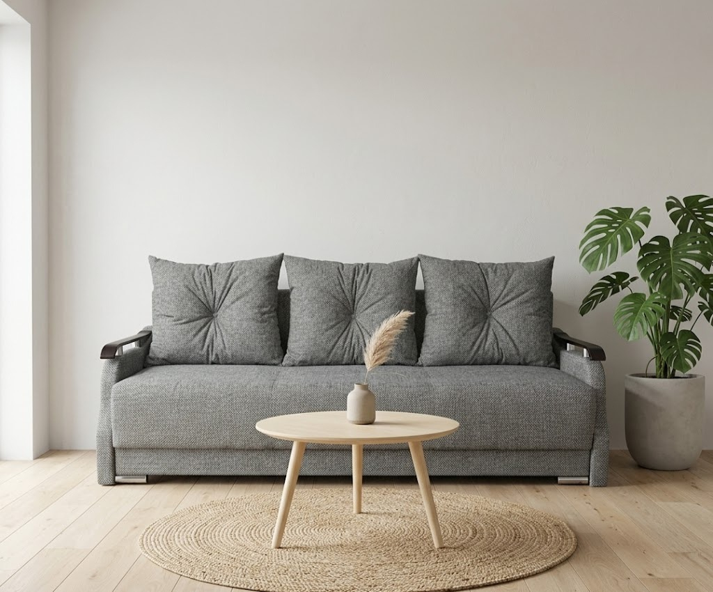 Canapea extensibila cu 3 locuri, cu un design simplu si brate cu ornamente din lemn care adauga functionalitate si eleganta.