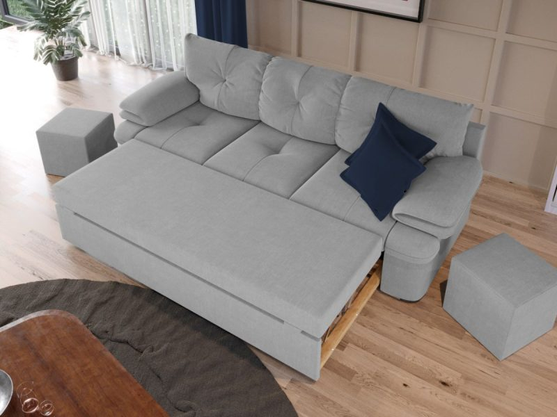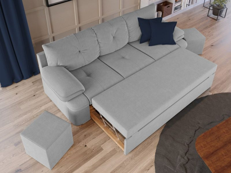 Sezutul si extensia canapelei sunt din poliuretan High Resilience. Scheletul este rezistent, realizat pe structura solida de fag si pal. Extensia de tip sertar este pozitionata sub sezutul canapelei. Se deschide ca un sertar, apoi se ridica salteaua din interiorul acestuia.