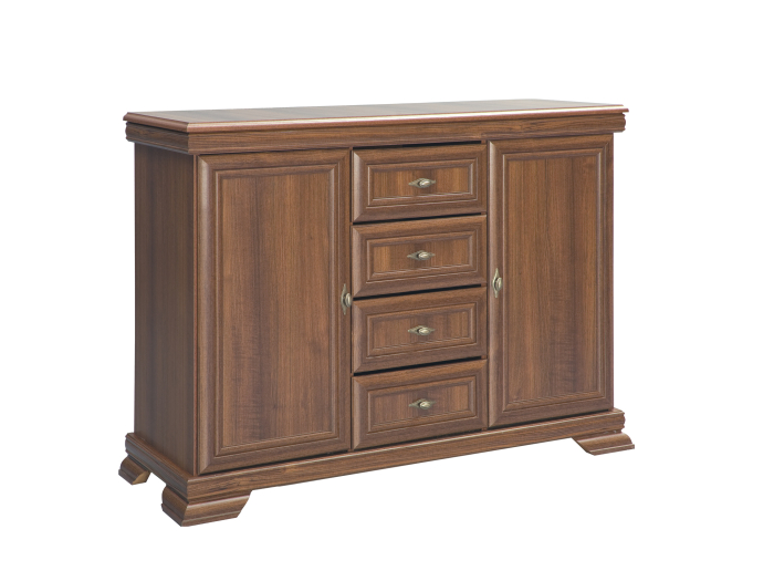 Această comodă cu finisaj în nuanță caldă de nuc este o piesă elegantă și practică, ideală pentru orice spațiu care necesită depozitare organizată și un aspect rafinat. Combinația de sertare și uși oferă o capacitate generoasă pentru diverse obiecte, păstrând totul ordonat și la îndemână.