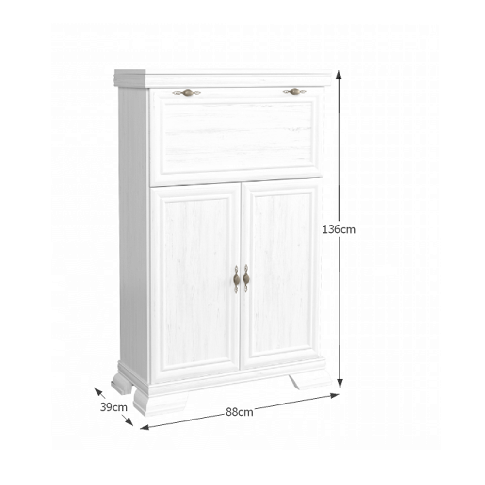 Această comodă verticală, în finisaj alb mat cu aspect de lemn texturat, este o alegere perfectă pentru interioarele clasice. Cu un design elegant și proporții compacte, oferă funcționalitate și un plus de rafinament în orice încăpere.