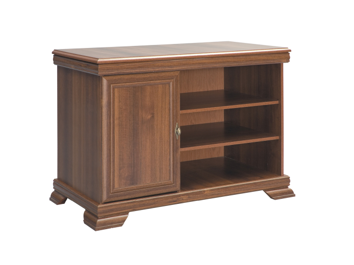 O ușă laterală cu deschidere clasică, ce ascunde două rafturi reglabile, ideale pentru accesorii, cabluri sau dispozitive media.