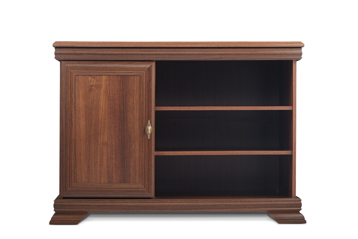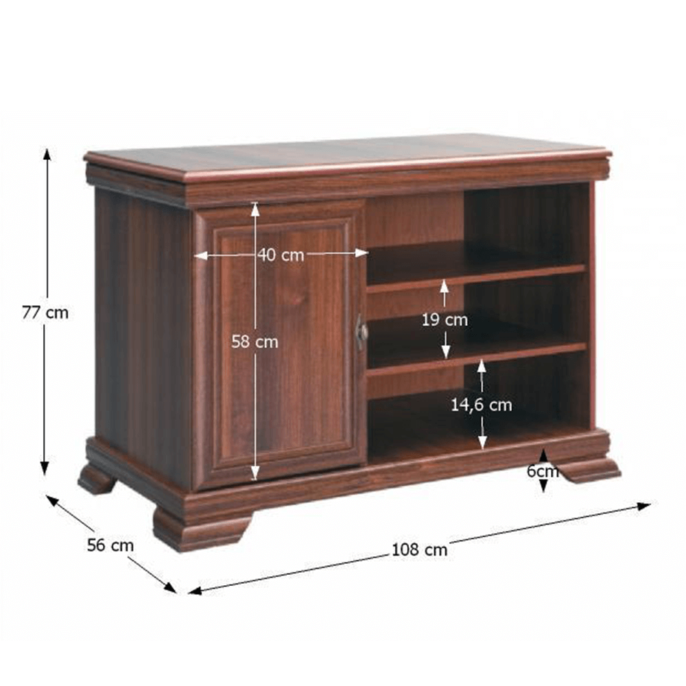 Această comodă TV îmbină cu eleganță rafinamentul clasic cu nevoile moderne de organizare și depozitare. Cu un design robust, finisaj în nuanță de stejar închis și detalii ornamentale elegante, comoda este o piesă centrală perfectă pentru orice living tradițional sau contemporan cu influențe vintage.
