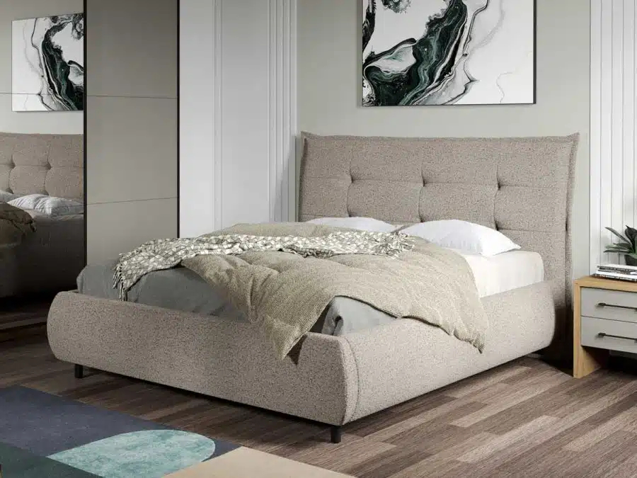 Pat Tapitat Bej – L 187 x A 220 x H 127 cm - Suport de saltea inclus. Sustine pana la 300kg. Compatibil cu saltea de 160×200 cm.
