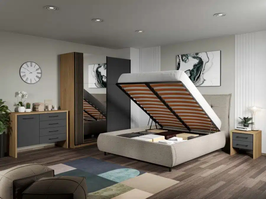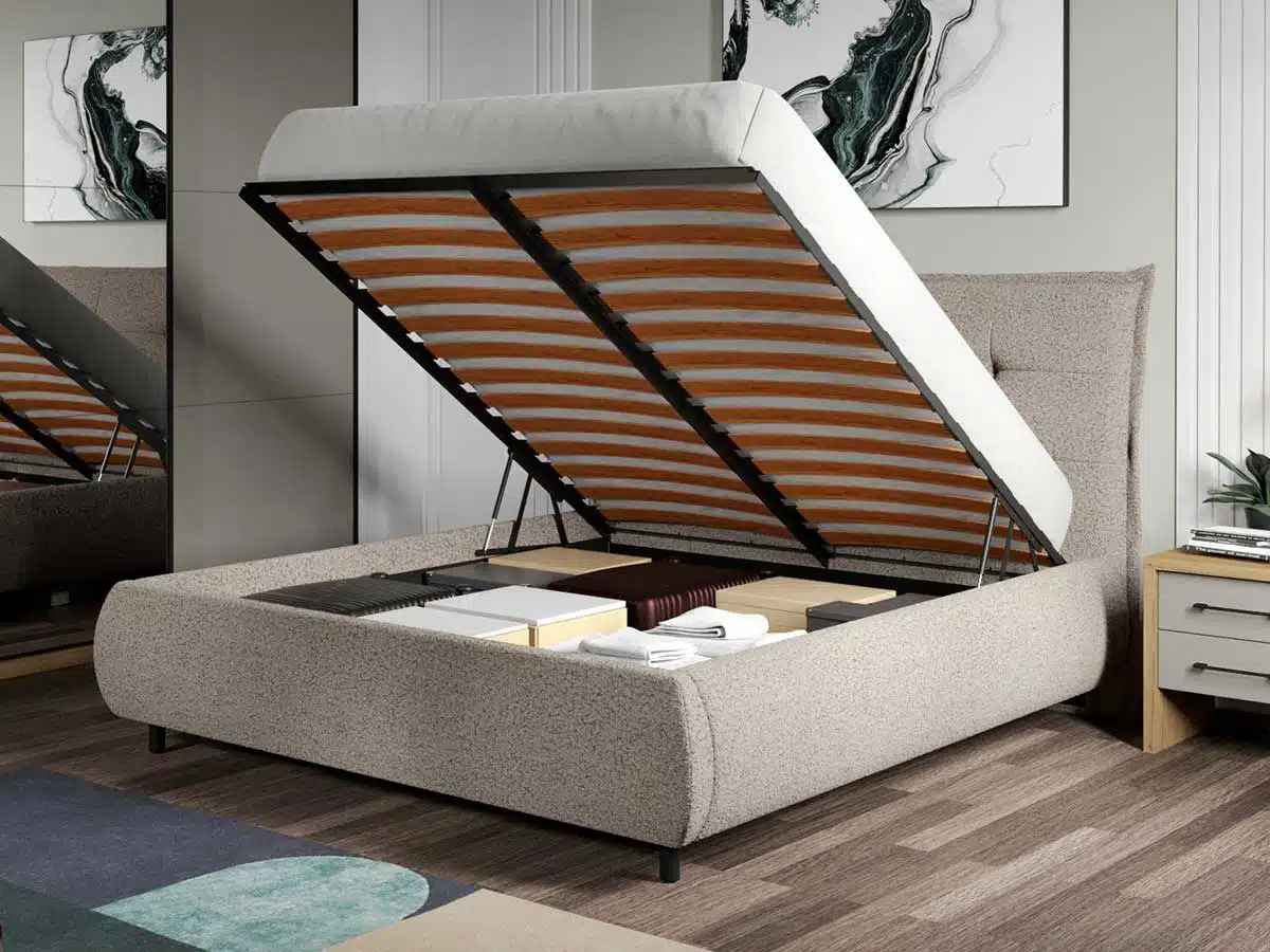 Este tapitat cu stofa plusata bej, iar somiera rabatabila cu pistoane (sistem gas lift) inclusa este realizata dintr-un cadru metalic, cu lamele din lemn. Patul are picioare de 10 cm, care permit aerului sa circule, astfel se ventileaza salteaua si spatiul din cadrul patului. Structura cadrului de pat este realizata din PAL de 16 / 18 mm si din lemn masiv.