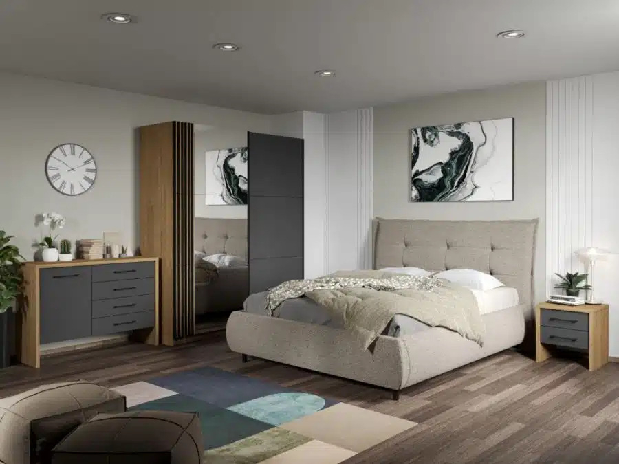 Set pentru dormitor Axel are un aspect modern, care ofera camerei un aspect cald si luminos si o atmosfera relaxanta. Acesta imbina finisajele Hickory si Alb / Casmir sau Gri Antracit cu baghetele cu aspect care imita riflajul si cu manerele si picioarele negre, creand un ambient primitor. Dulapul cu 2 usi glisante are dimensiuni generoase. Oglinda, pe langa utilitatea sa de baza, da senzatia de camera marita si spatioasa. Restul corpurilor de mobilier: comoda si noptierele ofera la randul lor spatii de depozitare in completarea dulapului. Patul are un aspect deosebit datorita formelor armonioase ale tabliei matlasate, stofei de culoare bej plusata, cat si a picioarelor negre.