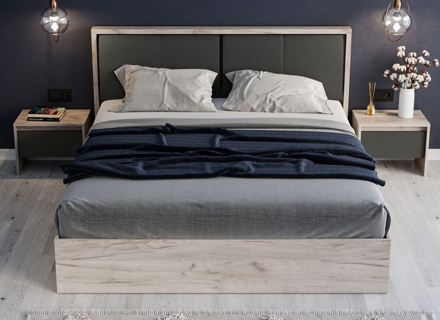 Pat matrimonial - Patul matrimonial mentine linia de design al setului de dormitor Indigo. Un design contemporan cu o combinatie de culori si stil ce tind spre unul scandinav, tapiteria gri pe langa confortul fizic ofera si un plus de frumusete si eleganta. Material tapiterie piele ecologica.