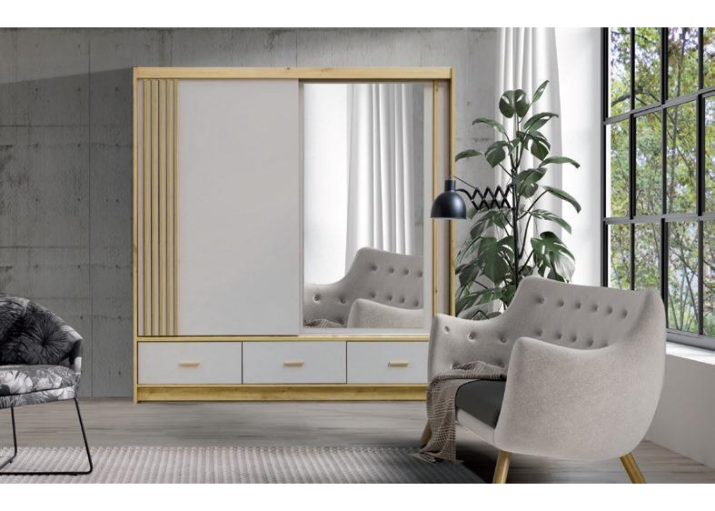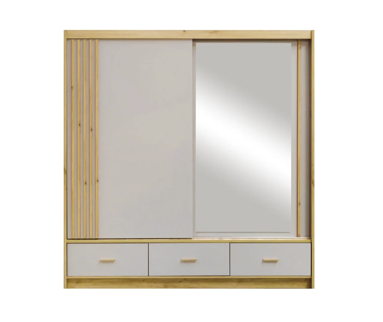 Cu un design contemporan și accente naturale, acest dressing este alegerea perfectă pentru interioarele moderne și luminoase. Cadrul din lemn cu finisaj deschis și fronturile in nuanta deschisa oferă un aer proaspăt, iar oglinda integrată adaugă profunzime și eleganță camerei.