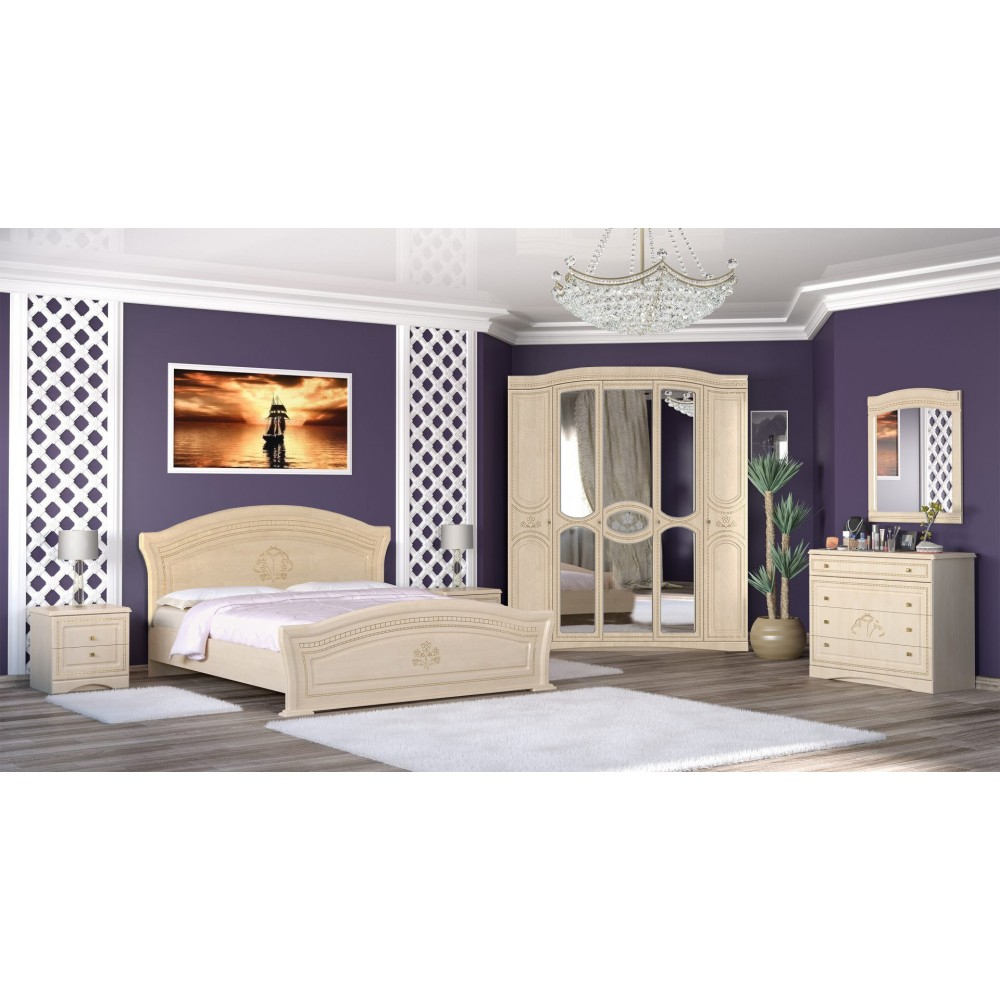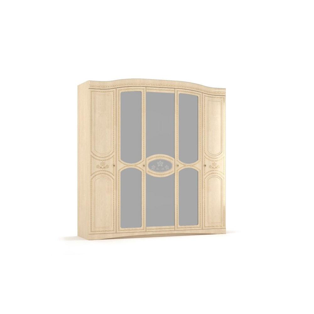 Materiale:  PAL melaminat Mesteacan cu grosimea de 16 mm pentru corp si MDF furniruit cu grosimea de 16 mm pentru fronturi. Oglinda pe cele 3 usi din mijloc.