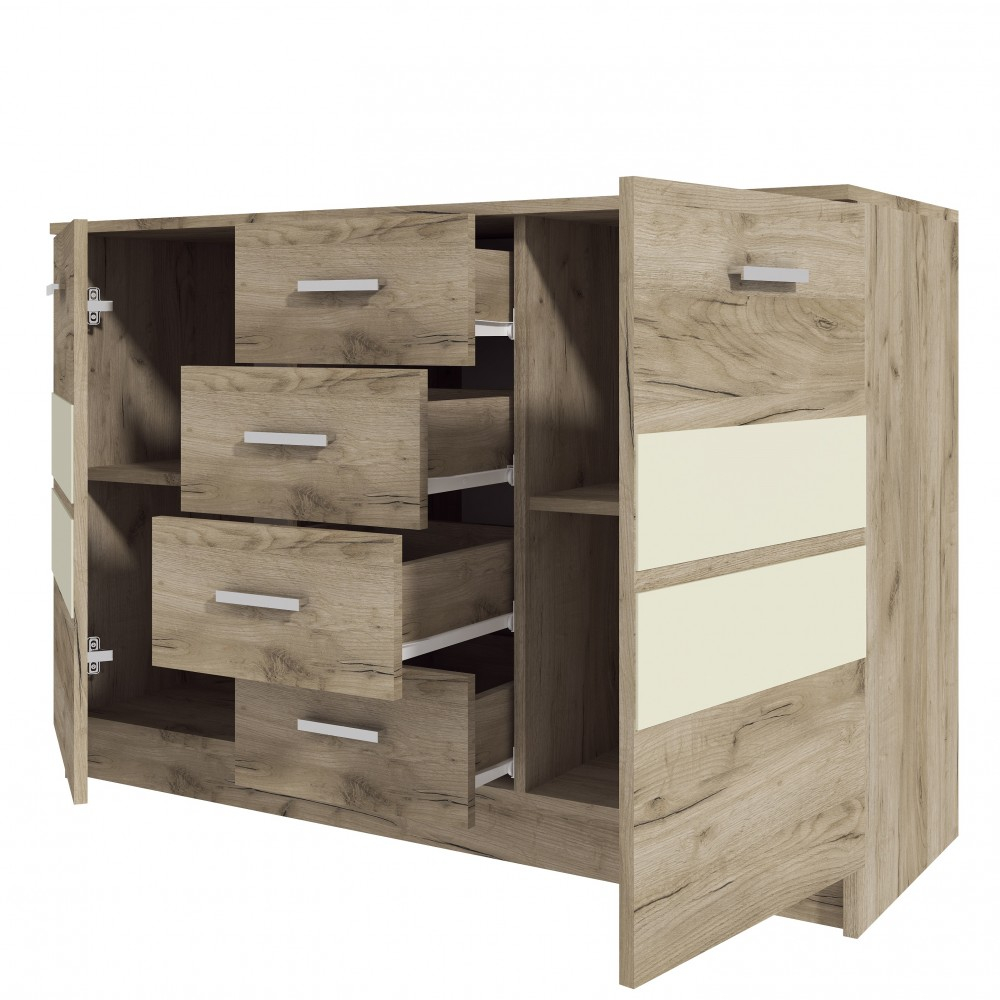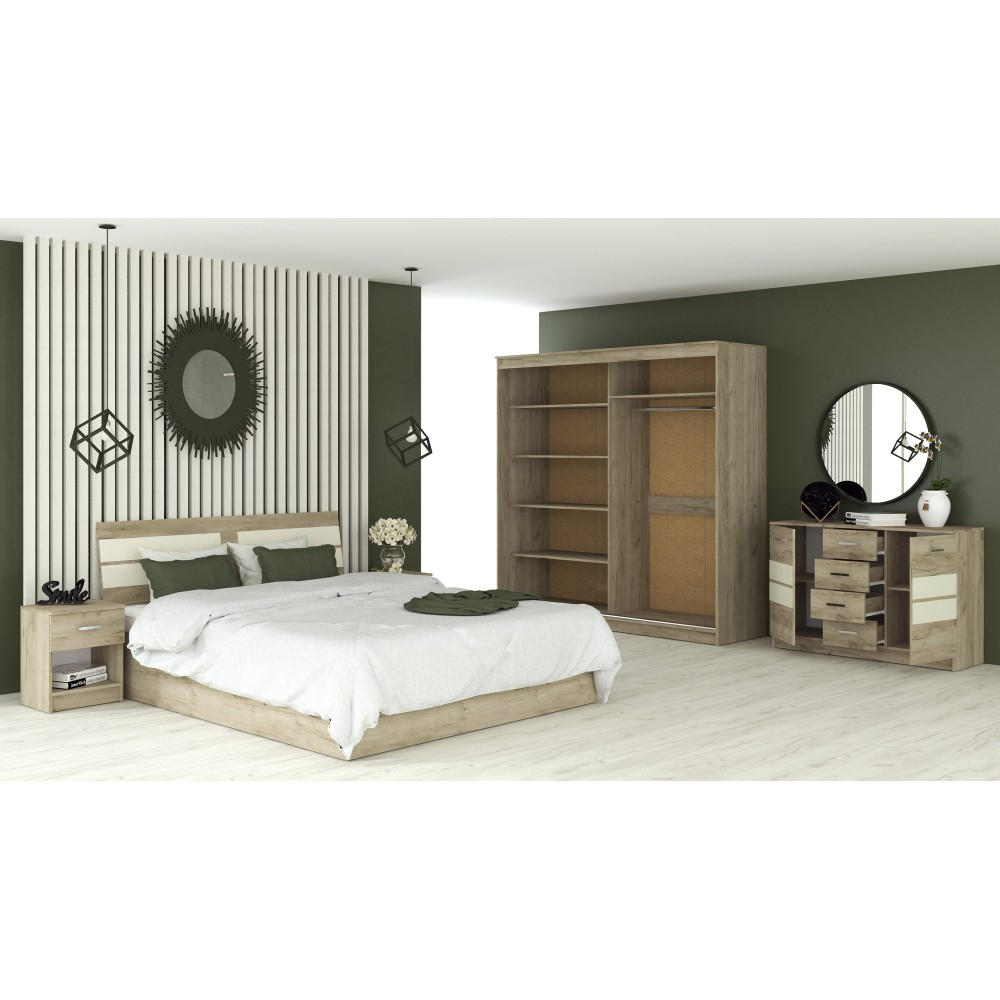 Materiale: PAL melaminat Stejar Gri Craft K002 atat pentru corp, cat si pentru fronturi. Ornamente din sticla pe tablia de la pat, comoda si dulap.