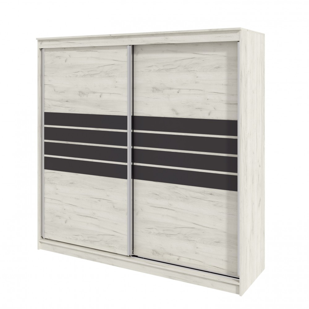 Materiale:  PAL melaminat Stejar Alb Craft K001 atat pentru corp, cat si pentru fronturi. Ornamente din sticla pe tablia de la pat, comoda si dulap.