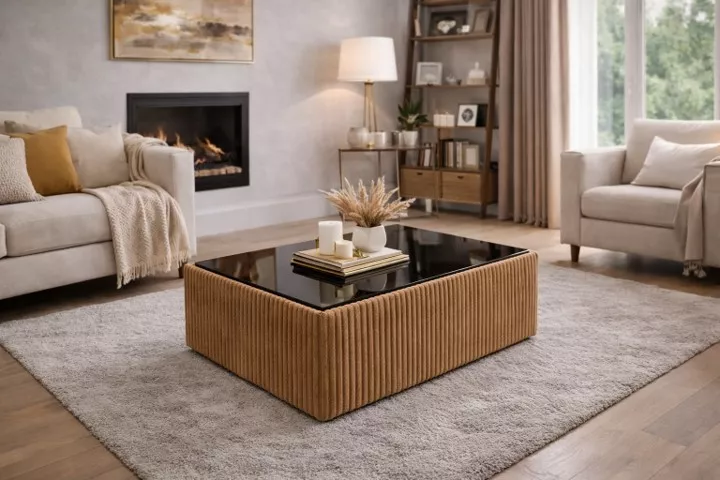 Masuta cafea tapitata LIMA caramiziu si blat MDF negru lucios