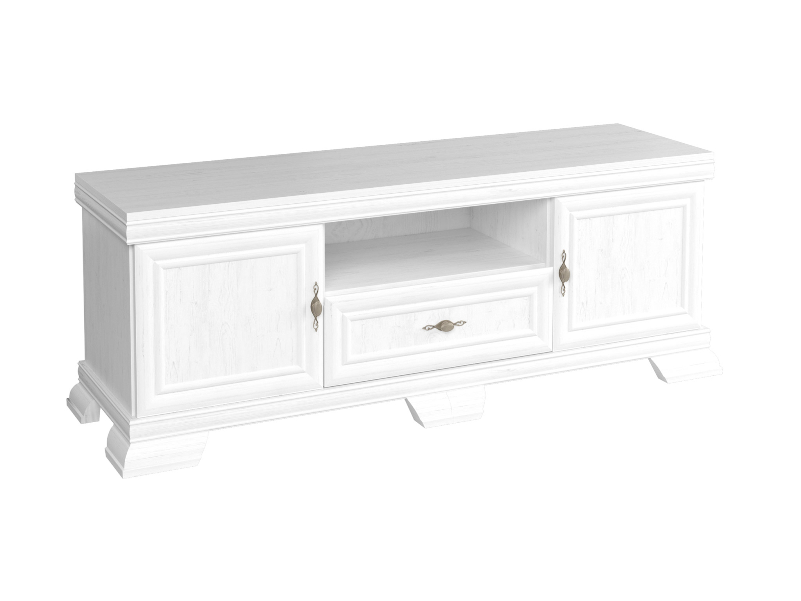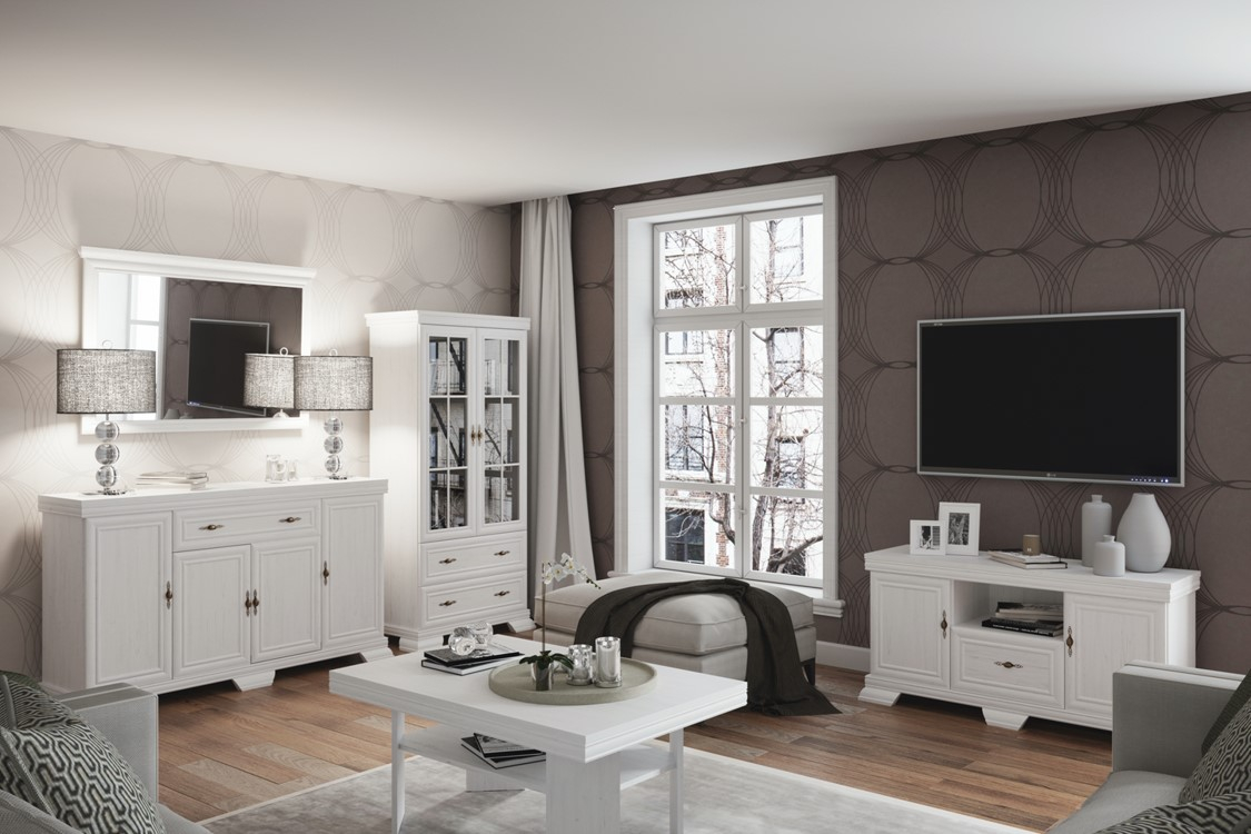 Această comodă TV impresionează prin designul său elegant, proporțiile echilibrate și detaliile clasice rafinate. Cu un finisaj alb cu aspect de lemn natur, este alegerea ideală pentru interioare luminoase, cu accente romantice sau vintage.