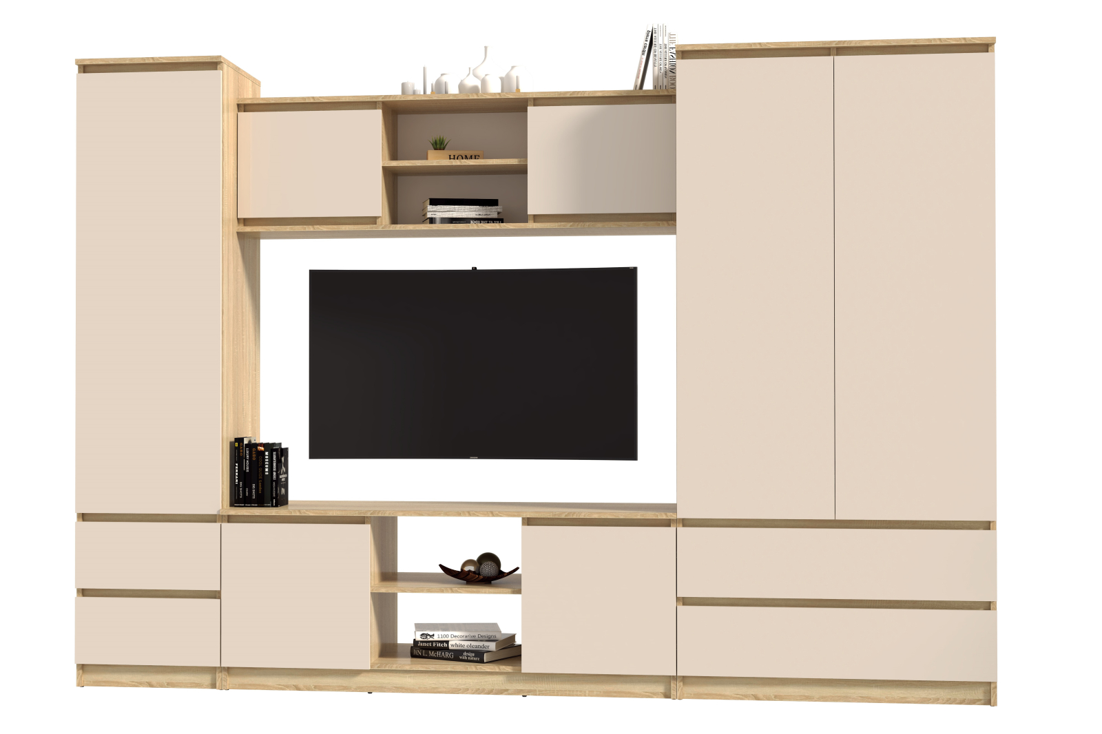Materiale: PAL melaminat cu finisaj stejar osini pentru corpuri, iar fronturile sunt din MDF acril cappuccino.