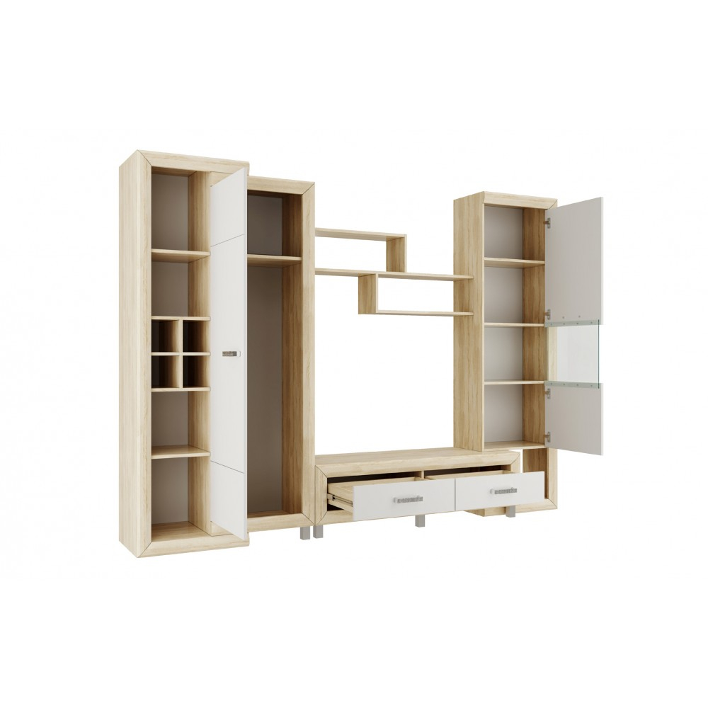 Materiale: PAL melaminat cu finisaj Stejar sonoma pentru corpuri, iar fronturile sunt din PAL melaminat cu finisaj Stejar sonoma si Alb lucios.