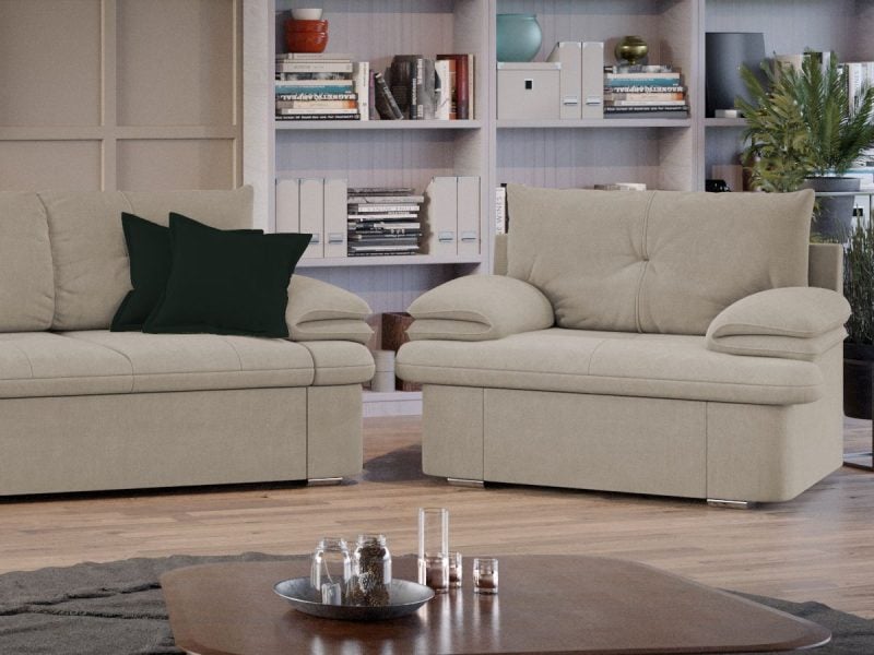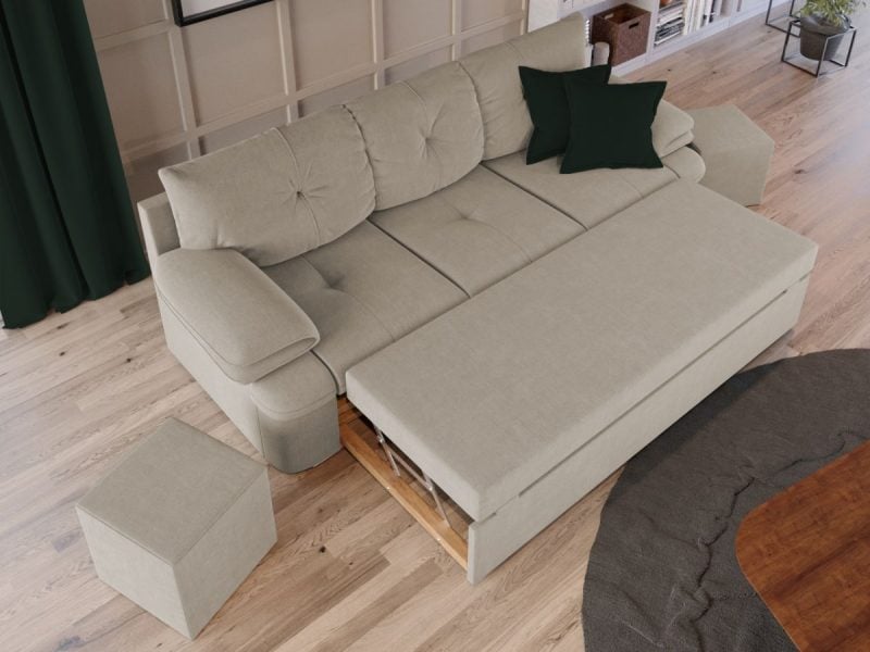 Sezutul canapelei, al fotoliilor si extensia canapelei sunt din poliuretan High Resilience. Scheletul este rezistent, realizat pe structura solida de fag si pal. Extensia de tip sertar este pozitionata sub sezutul canapelei. Se deschide ca un sertar, apoi se ridica salteaua din interiorul acestuia.