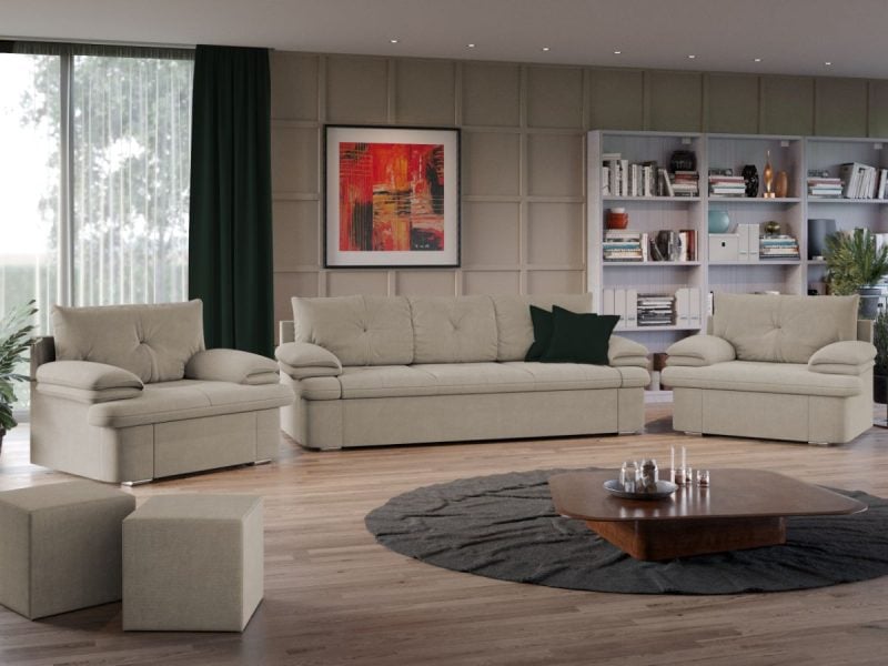 Oferind un spatiu compact si confortabil pentru relaxare, Set Canapea si Fotolii Roma se potriveste perfect cu numeroasele idei de amenajare a interiorului casei tale. Calitatea si un design modern sunt principalele caracteristici ale acestuia, creand o atmosfera primitoare si relaxanta. Pe langa nivelul de confort pe care il ofera, setul este alegerea potrivita pentru incaperi mari. Canapeaua se poate transforma intr-un pat confortabil cu suprafata utila 175 x 130 cm in doar cateva minute. Setul este tapitat cu stofa de calitate pe diverse culori. Pernele nu sunt detasabile.