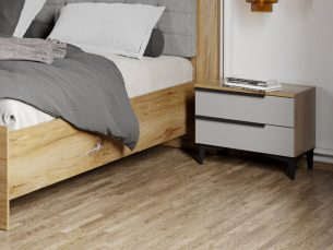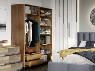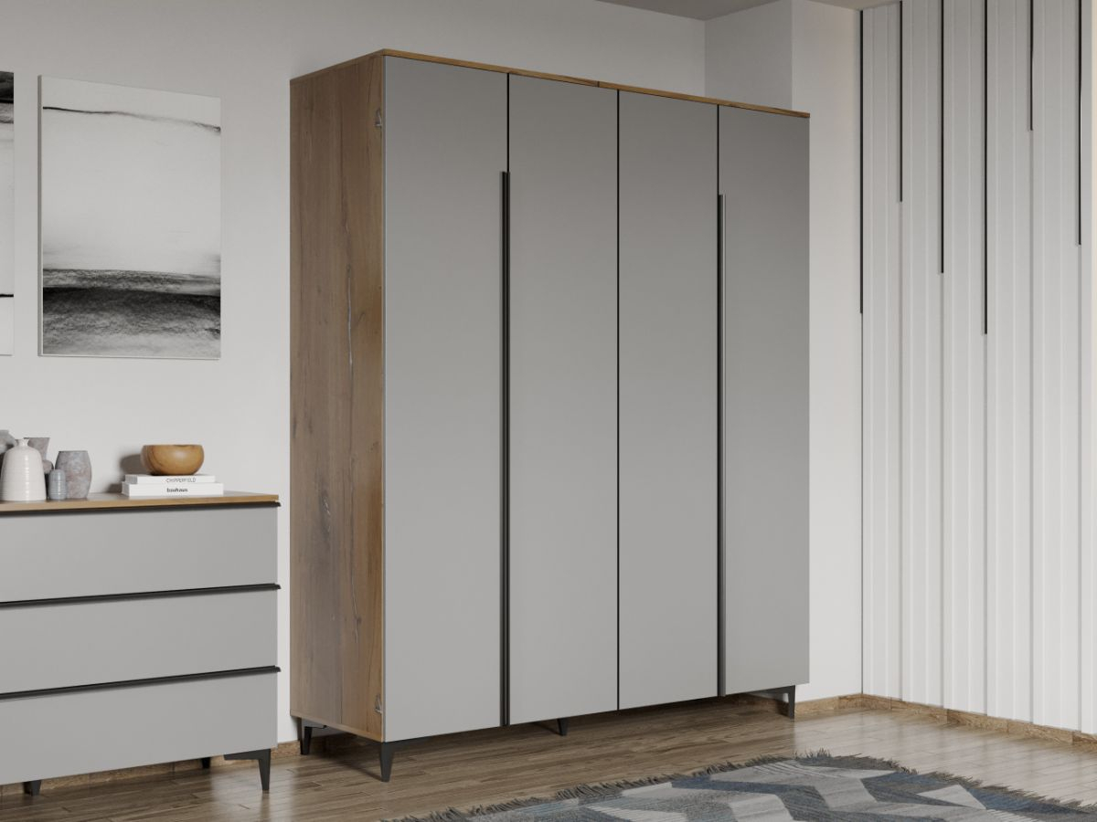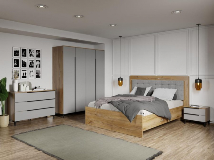 Un dormitor matrimonial ce are un aspect modern, imbinand finisajul Flagstaff Oak al carcaselor si Gri Pietris al fronturilor cu manerele si picioarele negre, creand un ambient cald si primitor. Dulapul cu 4 usi are dimensiuni generoase. Restul corpurilor de mobilier, comoda si noptierele, ofera la randul lor spatii de depozitare in completarea dulapului, prin sertare.