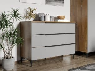 Comoda Toronto- Ideala pentru dormitor, hol sau living comoda are un design modern, combinand finisajul Flagstaff Oak al carcasei si Gri Pietris al fronturilor cu manerele si picioarele negre, ce ofera camerei un aspect cald si primitor. Comoda Toronto imbina intr-un mod armonios latura practica cu cea estetica, fiind dotata cu 3 sertare.