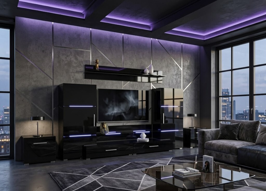 Da, livingul Kylie vine echipat cu kitul de lumini pentru polițele de sticlă, creând o atmosferă deosebită seara.