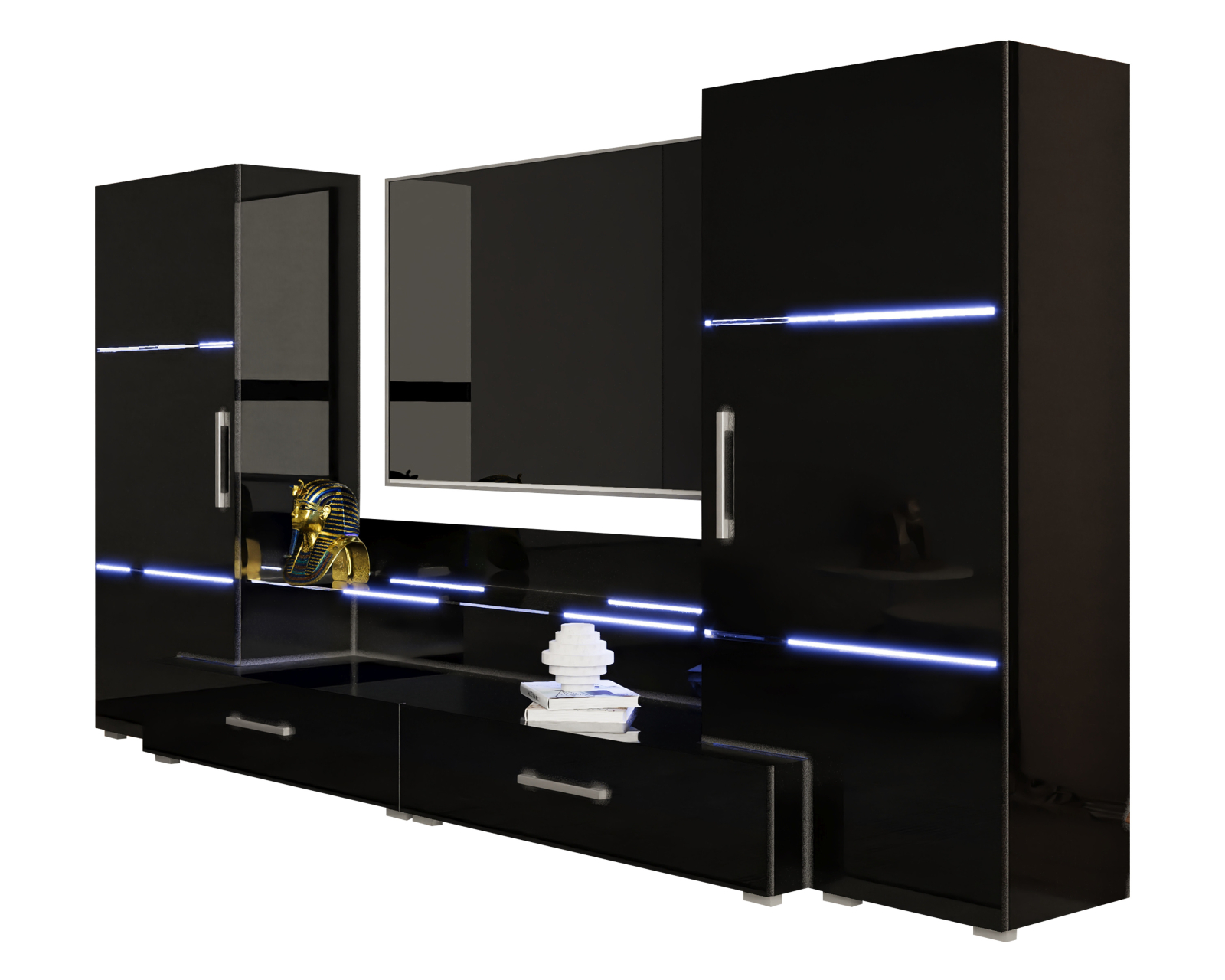 Materiale: PAL melaminat cu finisaj Negru pentru corpuri, iar fronturile sunt din MDF negru lucios.