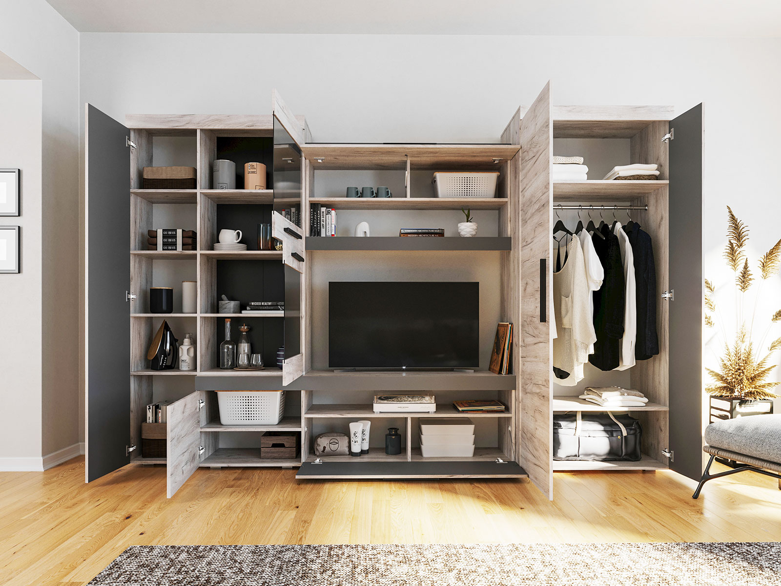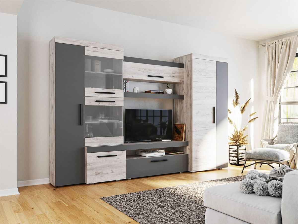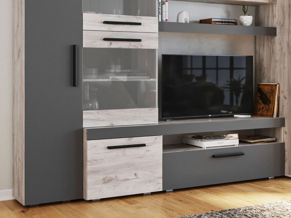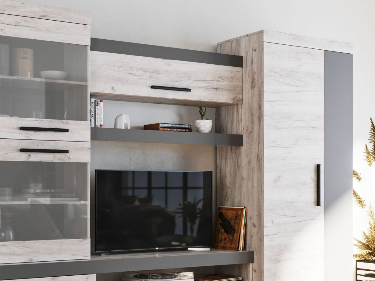 Mobilierul este proiectat astfel incat sa permita plasarea unui televizor, facandu-l extrem de versatil si adaptabil la diferite configuratii de living. Combinatia de Stejar cu  Gri Antracit accentuează un stil contemporan, integrandu-se armonios in orice decor modern.